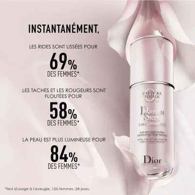 Le soin visage anti-âge global et créateur de peau parfaite, à appliquer à la place de votre crème hydratante ou en complément. Le fluide Dreamskin à l’action perfectrice et bienfaisante aide à recréer une peau naturellement sublime tout en luttant contre les signes visibles du temps : les rides, les taches et les rougeurs sont comme estompées. Jour après jour, le grain de peau est resserré et plus lisse. La peau retrouve un éclat intense. Également disponible sous forme de recharge, le soin visage Capture Dreamskin Care & Perfect s’ancre ainsi dans une démarche d’amélioration de l’empreinte environnementale de nos produits. Une peau de rêve, naturellement radieuse, intensément confortable et durablement parfaite. Instantanément, le soin fusionne avec la peau tout en procurant un confort intense grâce à un complexe unique* d’actifs hydratants. Son action perfectrice aide à affiner le grain de peau, les pores sont comme resserrés. Jour après jour, les taches et rougeurs s’estompent et le teint est plus éclatant. La peau est plus belle, même nue. * Chez Dior.